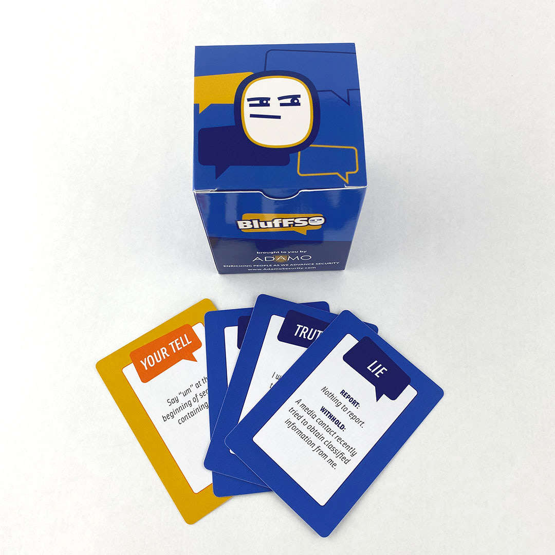 Logo, card and packaging design. A bluffing game to help cleared employees learn what needs to be reported in a way that doesn’t feel like training, based on the National Industrial Security Program Operating Manual (NISPOM) reporting requirements.